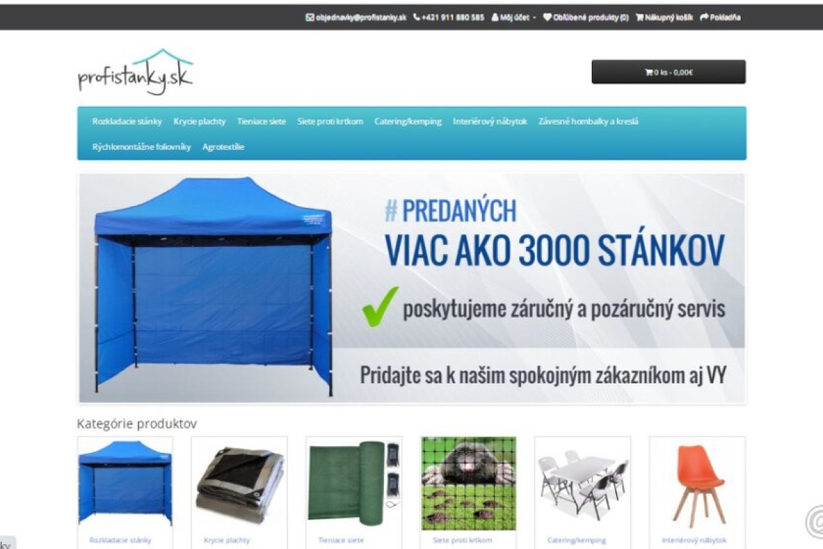 Ponúkam na predaj zabehnutý e-shop www.profistanky.sk, Ktorý pôsobí na trhu od roku 2009, zameraný na predaj profesionálnych rozkladacích stanov, krycie plachty agrotextilií a ďalších veľa produktov od dodávateľa + doplnkového príslušenstva.
