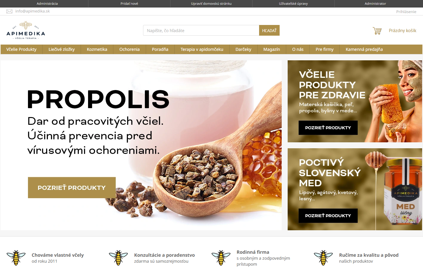 Apimedika.sk je e-shop zameraný na predaj prírodných liečivých produktov z oblasti včelárstva a ďalších prírodných zdrojov. Ponúka široký sortiment včelích produktov, ako sú med, propolis, peľ, materská kašička či perga, ako aj prírodné výživové doplnky a kozmetiku. Produkty sú prehľadne rozdelené do kategórií podľa chorôb a častí ľudského organizmu, čo zákazníkom uľahčuje výber vhodných prírodných riešení pre ich zdravie. Okrem kvalitných produktov kladie e-shop dôraz na ekologické balenie a odborné poradenstvo.
